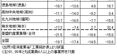 九0年代は製造業の中核を担ってきた地域産業集積においても、パフォーマンスが著しく低下した時期であった。代表的な産業集積二五カ所について見てみると、事業所数で二二%減、従業者数で一九%減、製造品出荷額で一九%、付加価値額で一六%減と軒並みのマイナスを示している。その下落幅は、同期間のわが国全体の落ち込みを超えるものであった。(表1)
