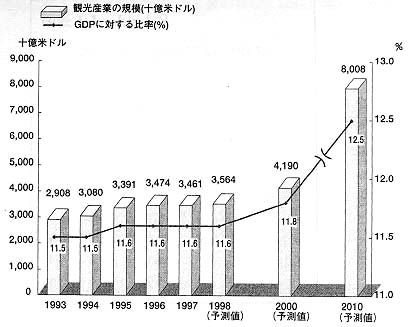 ※1.訪問の主要な目的が、訪問国内で報酬を得るための活動を行うこと以外の者で、1泊以上12ヶ月を超えない期間、居住国以外の国で通常の生活環境を離れて旅行する人 ※2.観光による直接の雇用(宿泊、飲食、航空、道路・水上交通、旅行会社)に加え、ある程度旅行者の存在に依存する間接的な雇用(小売店、レジャー産業、娯楽、金融・保険など)の一定比率分が含まれている。 (出典)JNTO国際観光白書1999年度版 |